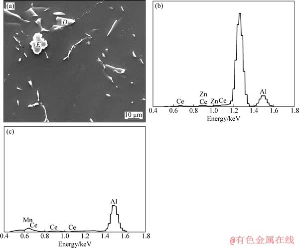 图4所示为AZ80、AZ80+Ce和AZ80+Y合金固溶态的微观组织。图5所示为AZ80+Ce合金固溶态的SEM像及化合物D和E的EDS谱。所有合金经固溶处理后,β-Mg17Al12相大部分溶于基体。AZ80+Ce镁合金在晶界和晶内仍然保留有针状相(见图4(b)中箭头所示)和少量块状相,通过对这两种相进行电子能谱分析发现,针状相是Al11Ce3相(见图5(a)中D相所示),块状相是Al8CeMn4相(见图5(a)中E相所示),这是由于Al11Ce3相的熔点高(熔点1235℃),几乎不溶于基体造成的;AZ80+Y镁合金在晶界附近残留有少量块状相,这些相应该是Al2Y和Al8YMn4相(见图4(c)箭头),Al2Y的熔点高达1 485 ℃,也不溶于基体。