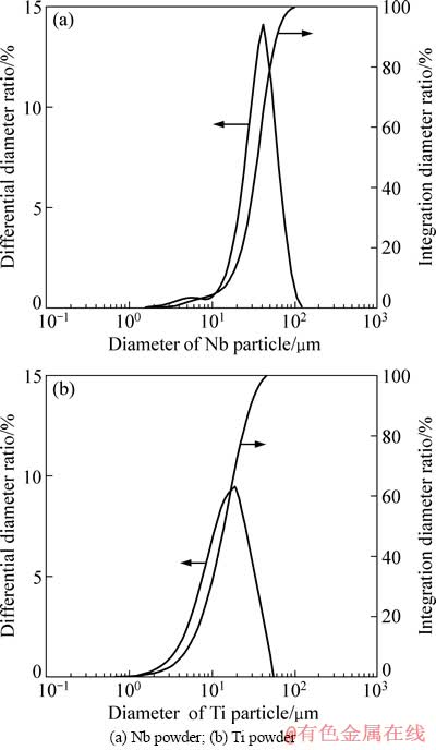 实验所用原料包括株洲硬质合金厂提供的Nb粉(型号为FXNb-1)、北京有色金属研究总院提供的Ti粉(型号为TiMO-1)、聚氨酯泡沫以及聚乙烯醇(PVA)。Nb粉和Ti粉的纯度≥99.5%,其粒度分布如图1所示。其中,Nb粉的平均粒度为40.52 μm,Ti粉的平均粒度为22.38 μm。模板为聚氨酯泡沫,孔径为593~847 μm。粘接剂为聚乙烯醇,分子式为[C2H4O]n,平均相对分子质量为127745,纯度为97.0%。