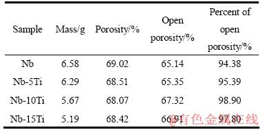 从表1可知,4组样品(每组含5个样品)的孔隙率和开孔隙率差值不大,其平均值分别为68.50%和66.18%,表明制备的多孔Nb-Ti合金具有高孔隙率和高开孔隙率,且Ti含量对合金孔隙率的影响不明显。此外,样品的开孔隙占总孔隙比率高达98%,能促进成骨细胞的粘附和增殖[13],增强植入物和人体组织的力学结合,有利于植入应用。