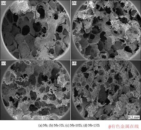 图3所示为多孔Nb-Ti烧结样品孔隙结构的SEM像。图3(a)中Nb的孔隙结构大多为近圆形,连通部分为块状,孔隙数量少,且孔径大小在500 μm左右,与有机模板支架相比较,其孔隙形貌接近,孔径大小略有缩小,这与文献[11]研究结果一致;Nb-5Ti中初步形成连续的孔隙网络,连通部分由块状向树枝状结构转变,孔隙尺寸收缩(见图3(b));图3(c)所示为Nb-10Ti的孔隙结构,其孔隙分布均匀,相互连通,连通部分多为树枝状,整体呈现蜂窝状结构;当Ti含量为15%时,孔隙三维连通程度降低,孔隙分布杂乱(见图3(d))。这种孔隙结构的变化可能与烧结过程中Ti的液相烧结有关。在1700 ℃等温烧结过程中,液体Ti含量增多,促进了Nb-Ti合金的烧结,导致合金的孔隙尺寸变小,孔隙数量增多,孔隙和连通部分的形状也发生相应变化。