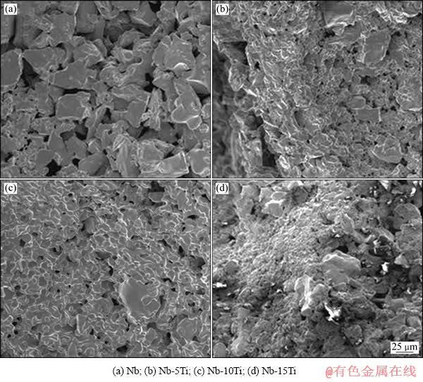 图4所示为不同Ti含量多孔Nb-Ti烧结样品中粉末颗粒微观形貌的SEM像。图4(a)中Nb粉颗粒间的接触点初步形成粘接面,颗粒分界清晰,少部分粉末仍呈现机械堆积;在Nb中加入5%Ti后,粉末颗粒表面出现波浪花纹,粘接面扩大,形成明显烧结颈,但仍可分辨出部分粉末颗粒(见图4(b));Nb-10Ti中烧结颈长大,颗粒彼此连接无法分辨,孔隙数量显著增多,且出现闭孔隙球化现象(见图4(c));而图4(d)中仅残留少量隔离小孔隙,部分位置Ti含量过高,烧结后形成光滑亮面。低熔点Ti颗粒对于Nb-Ti合金的烧结有促进作用,Ti含量增高,合金的烧结颈明显长大,孔隙进一步缩小球化,孔隙数量先增多后减少。其中,Nb-10Ti的粉末颗粒紧密结合,合金处于烧结过程的闭孔隙球化和缩小阶段,Ti颗粒对Nb的烧结促进效果最好。