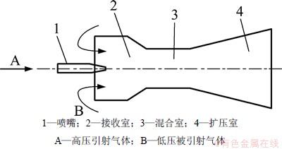 引射器利用高速射流的紊动扩散作用,使2股不同压力的流体相互混合并产生能量交换,已被广泛地应用于化工、军事等领域[9]。引射器结构包括:喷嘴、接收室、混合室和扩压室,其工作原理如图1所示:高压气流从喷嘴1高速喷出,被引射气流在引射气流的剪切作用下,被卷吸进入混合室3,继续与引射气流发生动量、能量交换,逐渐在扩压室4形成单一均匀的混合气流[10-12]。