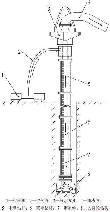 GQF-16大直径潜孔锤气力反循环钻具系统原理如图2所示:由空压机1输出的压缩空气经进气管2、气水龙头3、主动钻杆5、双壁钻杆6、进入潜孔锤7,驱动活塞冲击做功,驱动活塞做功后的压缩空气借助钻头内部的引射器结构引导流体进入双壁钻杆中心通道,形成孔底负压区,抽吸钻头8与孔壁之间外环空的空气,并携带钻头破碎的岩屑快速上返至地表。