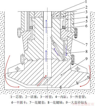 基于引射器原理设计的大直径气力反循环钻头的工作原理(见图3)是:压缩空气在驱动活塞2作功后,经由花键套7与花键轴8之间的间隙,进入花键轴8内部的导引孔,再经由喷嘴高速喷出;喷出的高速气流卷吸周围流体,在孔底形成负压区,进而抽吸钻头9与孔壁之间的外环空的空气,2股气流混合后携带钻头破碎的岩屑,经由芯管1高速上返至地表。