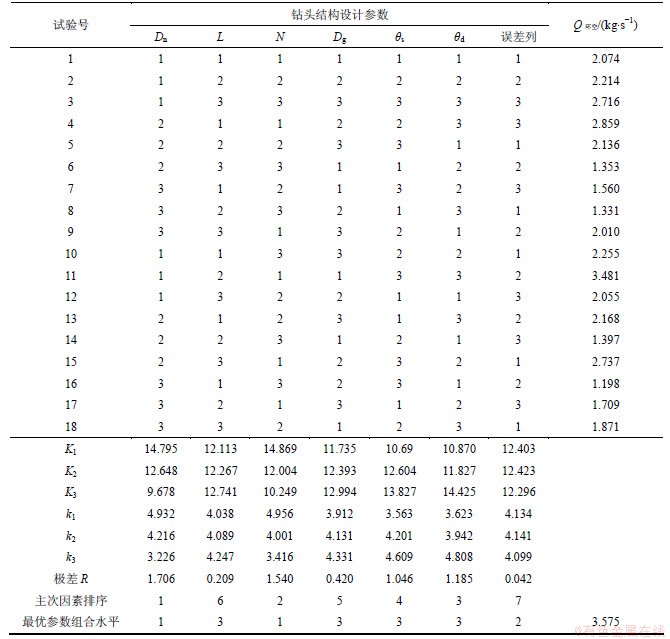 (2) 通过正交试验设计方法,得到钻头6个结构参数的主次因素和最优水平,优选出了最优理论参数组合。钻头6个结构参数显著影响目标值Q环空,L8(27)与L18(37)正交表中各因素的主次顺序一致,它们对目标值Q环空影响由大至小的顺序是:喷嘴直径Dn,喷嘴数量N,喷嘴偏转角度θd,喷嘴倾斜角度θs,引导段直径Dg,喷嘴长度L。