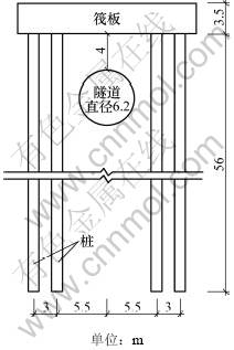 华润新鸿基钱江新城住宅项目坐落于杭州市钱江新城,东北面靠近庆春东路延伸段,东南面临近富春江路,拟建设住宅106 000 m2,主要由3幢超高层(高约150 m)住宅组成。其中:1号楼46层,室外地坪到屋顶露面高为150.6 m,底层设9 m超高架空层,按现浇钢筋混凝土全落地剪力墙结构布置,采用桩筏基础,筏板厚为3.5 m,筏板顶面标高为-9 m,桩长为56 m,桩径为1.2 m。而拟建杭州地铁4号线将穿越1号楼基础,地铁隧道直径为6.2 m,地铁隧道埋深为7.1 m(本文隧道埋深指筏板底面至隧道中心线的竖直距离),隧道中心线与相邻前排桩的水平距离为5 m。