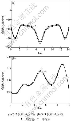 规定使筏板下部受拉的弯矩为负弯矩,使筏板上部受拉的弯矩为正弯矩。图5所示为地铁隧道开挖前后筏板2-2板带和3-3板带(见图3)弯矩图。从图5可以看出:地铁隧道开挖引起筏板弯矩增大,但增幅较小。这是由于地铁隧道开挖后,隧道区域内的筏板正下方土体向下位移,与筏板底部发生脱离,原本土体承担的荷载转移给靠近隧道两侧的桩,增大了筏板的挠曲变形。