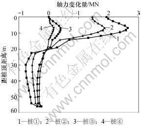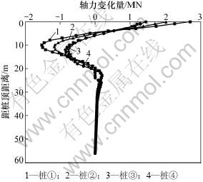 图3中①~④为桩的编号,分别代表前排边桩、中桩,后排边桩、中桩。从图6可以看出:隧道开挖后,距桩顶20 m的范围内桩身轴力增加,且第1排桩轴力增幅明显比第2排桩轴力的增幅大,同一排桩边桩轴力大于中桩轴力。一方面,由于隧道开挖后筏板正下方的土体向下位移,与筏板分离,这部分土体原来承担的荷载转移到附近的桩上,使桩身轴力增加;另一方面,桩侧土体向隧道方向位移,引起桩侧土应力松弛,桩侧阻力减少,桩身轴力相应增加。桩身最大轴力增量发生在隧道起拱线附近,其中①号桩增加约24%,②号桩增加约20%,而③和④号桩轴力增量都不到4%。