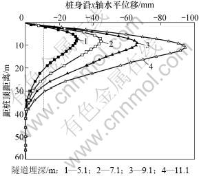 隧道埋深对①号桩水平变形的影响如图9所示。从图9可以看出:随着隧道埋深的增加,桩身水平变形最大值依次增加,且桩身水平变形最大值出现位置距离桩顶距离增加而依次增加,均在隧道起拱线附近。由于筏板对桩顶的约束作用,故隧道埋深越浅,桩身水平变形最大值越小。隧道开挖引起的桩身水平变形主要发生在桩顶至3倍隧道埋深的桩身范围内(本文隧道埋深指筏板底面到隧道中心线的竖直距离)。