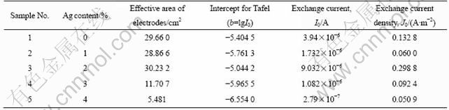 交换电流密度是表征电化学反应动力学的基本参数,也是表征电化学催化剂内禀催化活性的基本参数,故本研究通过交换电流密度来比较不同Ag含量对La0.4Ca0.6CoO3电催化活性的影响。交换电流密度采用Tafel曲线图解法求取,具体方法可参考文献[22]。将表1所列不同Ag含量的催化剂粉体进行了Tafel测试,图7和8所示分别为La0.4Ca0.6CoO3粉末微电极和La0.4Ca0.6CoO3+2%Ag粉末微电极的Tafel曲线。根据Tafel曲线图解计算得到的各样品的交换电流密度值列于表1中。图9所示为Ag含量与交换电流密度的关系图。从图9可看出,添加2%Ag的粉体交换电流密度最大,表面积也最大,因而催化活性最高。