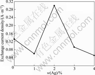 2) 在La0.4Ca0.6CoO3中引入Ag+可显著提高其对氧还原的电催化活性。在Ag含量为2%时,催化氧还原的交换电流密度达到最大值0.298 8 A/m2;Ag含量进一步增加时,交换电流密度又下降,原因是晶格中Ag+的固溶量减小了。