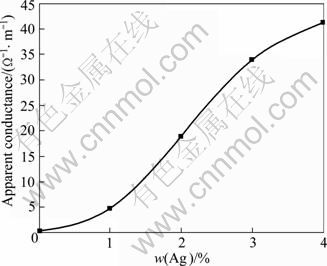 3) La0.4Ca0.6CoO3的表观电导率随着Ag含量的增加而增大。在Ag含量为2%时,表观电导率达到18.9 S/m;在Ag含量为4%时,表观电导率为41.2 S/m。