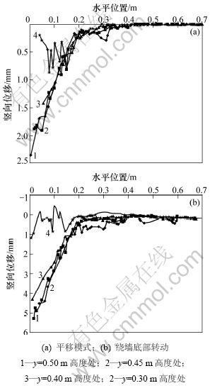 Fig.6 Vertical displacements of particles with different retaining wall movement models