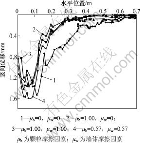 Fig.7 Vertical displacements of particles with different frictional coefficients
