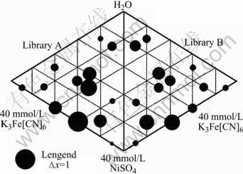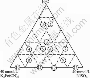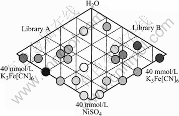 Fig.1 shows a ternary diagram with varying volume fraction of three source reagents Fe3+(40 mmol/L K3Fe(CN)6), Ni2+(40 mmol/L NiSO4) and distilled H2O. The reagent percents labeled 1-13 were chosen to assess the range of materials produced with this combinatorial approach.