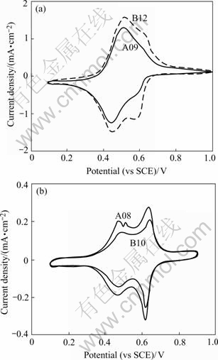 Fig.2 shows the plot of the final cyclic voltammo- gram(CV) for part films on Pt electrodes in 1 mol/L KNO3 solution. The positive currents correspond to the oxidation of NiHCF with K+ deintercalation from the matrix and negative currents denote the reduction with K+ intercalation. Fig.2 shows that the different preparation procedures for each film leads to quite different reversible charge densities and CV shapes. Some CVs from Ni2+-rich growth conditions display a predominant lower-voltage peak (0.48 V), such as A09, B12 in Fig.2(a); whereas other CVs from Ni2+-poor growth conditions show two comparable peaks (0.48 V and 0.6 V) separated by roughly 100 mV, such as A08, B10 in Fig.2(b).