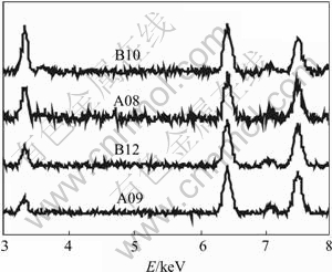 After film growth, each sample cycled 15 times in a 1 mol/L KNO3 solution from 100 to 1 000 mV at 25 mV/s. The sample was then rinsed with distilled H2O and cycled more 15 times in the same manner. After the cyclic voltammetry, the sample on platinum substrate was placed in oxidized (1 000 mV) state by holding the potential for 15 min. The sample was emersed from solution while still under potential control, then quickly rinsed, and dried in air. EDS spectra was acquired next.