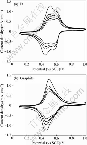 The cycle life is an important property to assess ESIX films. The voltammetric cycles mimic redox switching in an ESIX process and are a measure of cycling stability. The CVs change of films on Pt and graphite are investigated in 1 mol/L KNO3 at 25 mV/s for 1000 times. Fig.7 clearly indicates decreases in cation loading capacity as a function of cycling. After 1 000 cycles, the Pt film demonstrates a loss of about 37.45% of its capacity and the graphite film lost only 24.5% of its capacity. But they still have good redox activity. Also note that two distinct peaks appear in the CVs of Pt substrate with the increasing of the cycle number. This may be caused by structural modifications in the NiHCF film with cycling. But the CVs of graphite substrate keep the same shape as the first cycle. So the film on graphite shows better stability and is suitable for the application of ESIX.