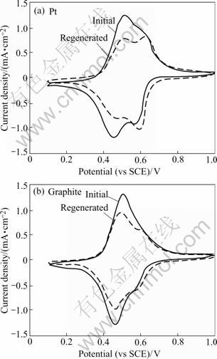One advantage of ESIX technology is that the transition of oxidized and reduced states corresponding to unloading and loading of metal ions of NiHCF thin film is easily controlled by electrochemistry. Accordingly the metal ions are separated and thin films are regenerated. The film used in the solution containing Cs+ is called Cs+ form. The regeneration of the thin films on Pt and graphite substrates from the Cs-form to the K-form can be accomplished by cycling a Cs-loaded film in a K+-containing electrolyte. Fig.8 shows the voltammograms of regenerated films at the 25th cycle in 1 mol/L KNO3 solution. For comparison, the initial CVs of the films are also shown in this figure. After regeneration the CVs for Pt and graphite films have 77% and 80% as much ion-exchange capacity as initially CVs in K+-containing electrolyte respectively. The ion exchange capacity could be increased with the cyclic number and the regenerated NiHCF films on Pt and graphite still have good redox reversible activity.