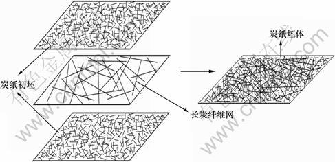 质子交换膜燃料电池(PEMFC)作为一种清洁、高效的绿色环保电源,是新能源汽车、固定发电站等的首选动力源。气体扩散层(GDL)是PEMFC的关键组件之一,高性能的GDL不仅需要良好的导电性、高的孔隙率来为电极反应提供电子通道、气体通道和排水通道,还必须具备一定的机械强度以实现支撑催化层、稳定电极结构的作用[1-7]。炭纸是以树脂炭为基体,以炭纤维坯体作为增强相的二元复合材料,由于其优异的导电能力和极佳的气体扩散效果,成为当前国内外PEMFC研究单位优先选用的GDL基材。纤维是炭纸中承担载荷的主要组元,炭纸中纤维的长度、体积含量、力学性能等参数是影响GDL强度的主要因素[8]。普通的炭纸坯体是将单丝直径为3~9 ?m,长度为2~8 mm的短切炭纤维与有机粘合剂、分散剂、表面活性剂等混合后,利用湿法[9]或干法[10]成形技术制成。短切炭纤维容易分散均匀,有利于保持坯体的均匀性和各向同性,但是用短纤维坯体制备的炭纸机械脆性大,柔韧性差,且强度低,抗震能力差[11],在制作电极和电池使用过程中极易被损坏,不利于保持电池的耐久性,严重制约了PEMFC的发展,已经成为目前PEMFC商业化的瓶颈[12]。因此,在兼顾炭纸的其它基本性能的基础上,对炭纸坯体进行改性以提高炭纸的强度和韧性具有重要意义。一般而言,长纤维对复合材料的增强增韧能力要明显优于短切纤维,更能发挥增强相的作用[13-14]。在此,本文作者将少量长炭纤维网引入炭纸,研究了长纤维的加入对炭纸基本性能的影响。