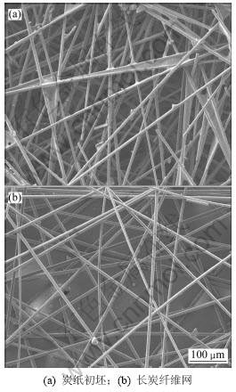 图2所示为炭纸初坯和长炭纤维网的表面形貌。由图2可以看出:初坯中纤维含量较高,坯体较为密实,而长炭纤维网中纤维含量低,结构疏松;在相同的放大倍数下,初坯中有较多不连续纤维,而长炭纤维网中几乎没有不完整的纤维,说明初坯中的纤维长度比长炭纤维网中的纤维长度短。