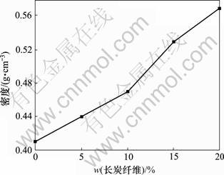 Fig.3 Effects of long carbon fiber content on density of carbon paper