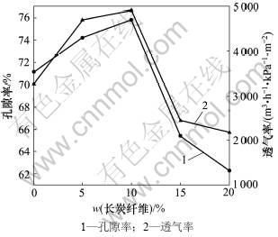 图4 长纤维含量对炭孔隙率和透气率的影响
