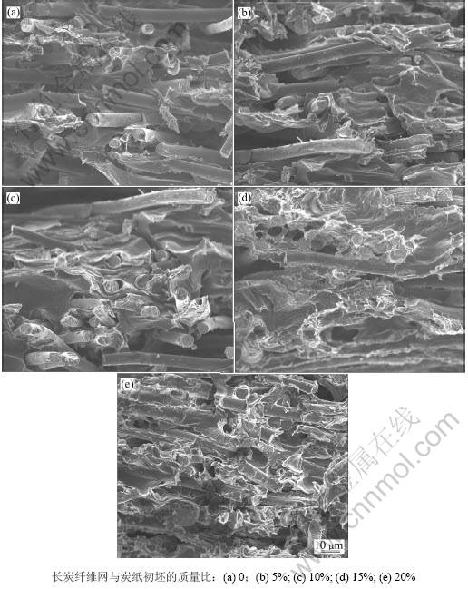 根据改性酚醛树脂的残炭值计算需要配制的浸渍液的浓度;炭纸坯体合成过程如图1所示。把初坯与长炭纤维网裁成15 cm×25 cm的规格,分别把0,2,4,6和8份长炭纤维网叠合起来(即取占炭纸初坯(两片)质量0,5%,10%,15%和20%的长炭纤维网)铺置于2片初坯之间合成炭纸坯体;用改性酚醛树脂作粘合剂对坯体浸渍增密,置于烘箱中于70 ℃恒温烘干后在平板硫化机(XLB-D)上加压固化;将固化后的炭纸预成型体在240 kW气相沉积炉上进行炭化和石墨化(2 000 ℃)制得炭纸。