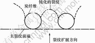 (3) 纤维含量对炭纸强度的贡献。炭纤维的强度和模量要比基体炭高的多[18],因此,纤维是炭纸中承担载荷的主要组元。长纤维的加入使炭纸中的纤维总量增加,纤维含量对炭纸力学性能的贡献可从3个方面来理解:(1) 随着纤维体积含量增加,纤维与纤维间的基体层变薄,作用在炭纸上的载荷易于通过基体而传递给纤维,载荷的迅速转移可以有效防止炭纸发生灾难性破坏。(2) 如图8所示,基体中的扩展的裂纹遇到网状分布的纤维时,裂纹尖端曲率半径变大发生钝化[19],导致裂纹减小或消除,纤维含量越高,裂纹钝化的机率越大,其对裂纹的限制作用就越强,只有提供更大的能量才能使裂纹绕道使其继续发展; (3) 当载荷由基体传给纤维后,随着长纤维含量的增加,炭纸中承担载荷的组元含量也随着增加,炭纸的强度也随之提高。