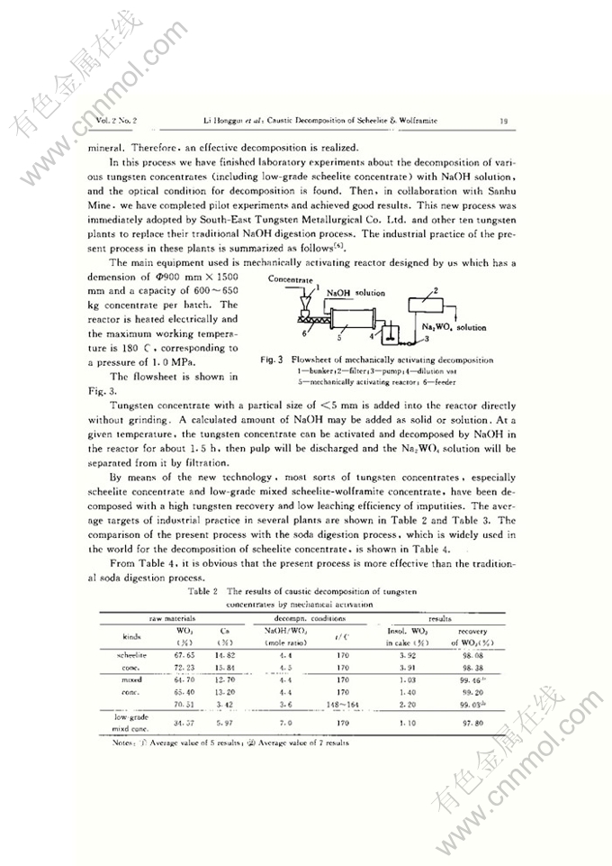 Abstract: Based on physicochemical study of the reaction between scheelite and NaOH, a new decomposition process for scheelite and scheelitewolframite concentrate, i. e., mechenically activating caustic decomposition has been developed, and it has been successfully used on a commercial scale in 11 tungsten plants in our country. Industrial practice has shown that a tungsten recovery higher than 98% for sheelite concentrate and 99% for scheelite-wolframite mixed concentrate is obtained, under the conditions of NaOH/WO3 mole ratio of 3. 6~4. 8, 160-170 C,and it is suitable to treat almost any sort of tungsten ore concentrates, including low grade complex concentrate, and it is more effective than the traditional soda ash digestion process.