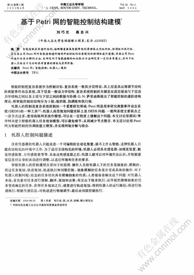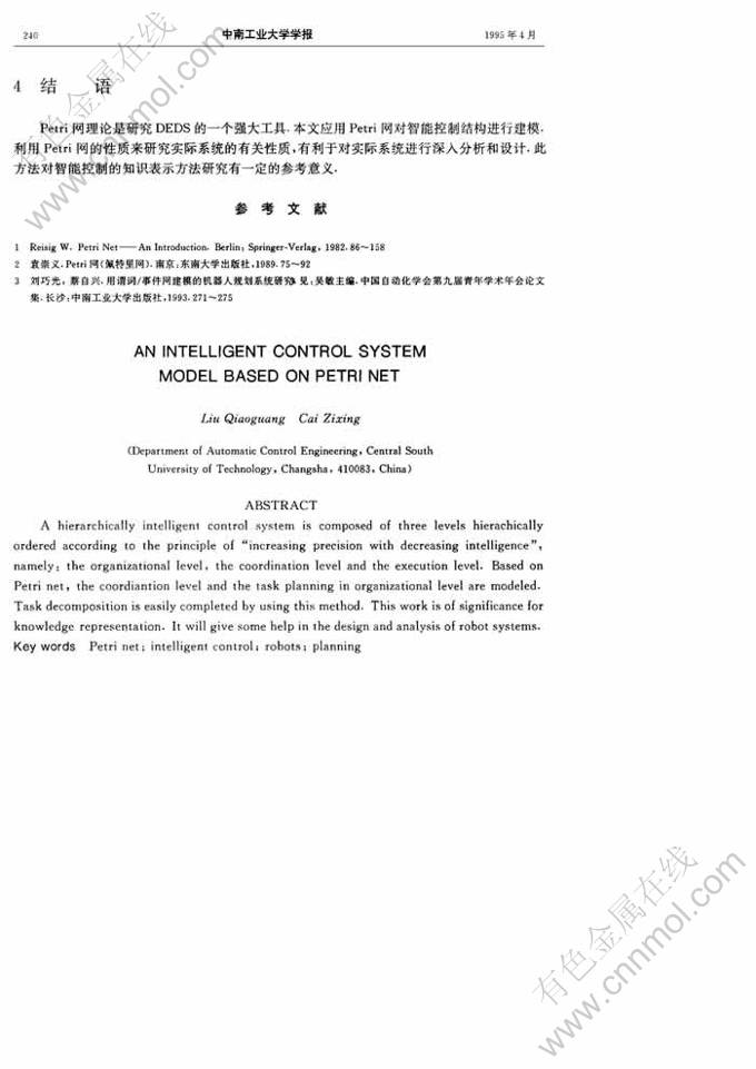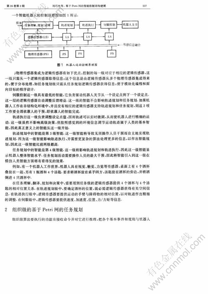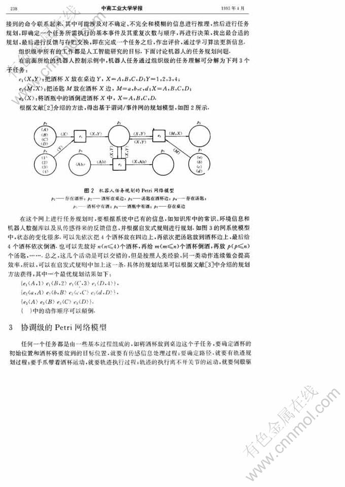 摘 要:智能控制具有递阶结构,按照精度提高智能降低的原理依次为组织级、协调级和执行级。本文提出用Petri网对智能控制递阶结构中组织级的任务规划和协调级进行建模,并提出用Petri网进行任务分解的方法。本研究对于智能控制的知识表示方法研究有一定的参考意义,并对于机器人系统设计与分析具有重要的理论与应用价值。