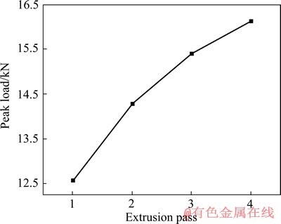 图2给出了峰值载荷与ECAPT变形道次之间的变化关系。