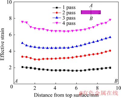 Fig. 3 Effective strain of billet on longitudinal plane at different ECAPT passes