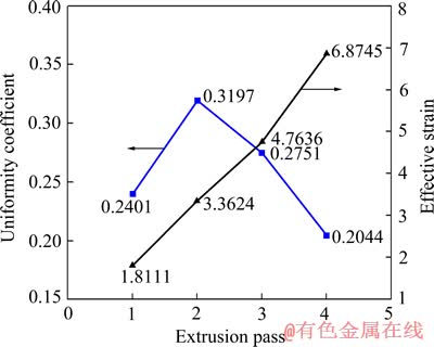 从图4可以看出,随着挤压道次的增加,坯料的变形均匀性不断发生变化,呈现出“先上升后下降”的变化趋势。2道次ECAPT变形后,坯料变形均匀性系数最大,表明此时坯料内部变形均匀性程度最差。此后,坯料的变形均匀性逐渐提高,4道次变形后变形均匀性系数达到最小,表明此时坯料内部变形较为均匀,达到了最佳状态。