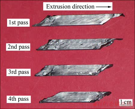 图5所示为1~4道次ECAPT变形结束后坯料的宏观照片。可以看出,200 ℃条件下坯料各道次的变形较为顺利,变形后坯料整体完好,表面质量较好,均未出现裂纹、断裂、破坏等现象。仔细观察还可以发现,随着变形的继续进行,由于模具型腔内工作条件逐渐恶化以及材料变形抗力的不断增大,坯料变形难度逐渐加大,头尾两个端面的斜度越来越大,表面的“挤痕”愈发明显。