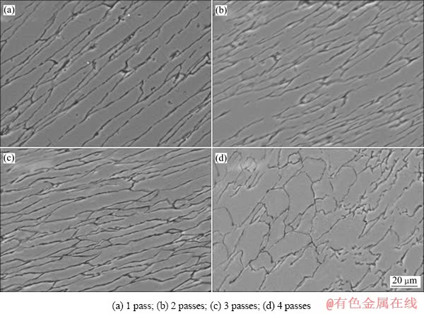 图6 不同道次ECAPT变形后坯料组织的SEM像