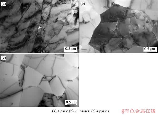 图7 不同道次ECAPT变形后坯料组织的TEM像