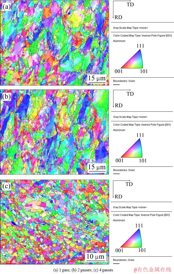Fig. 8 EBSD orientation maps of billets under different ECAPT passes