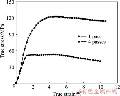 图9 ECAPT变形后坯料的真应力-真应变曲线