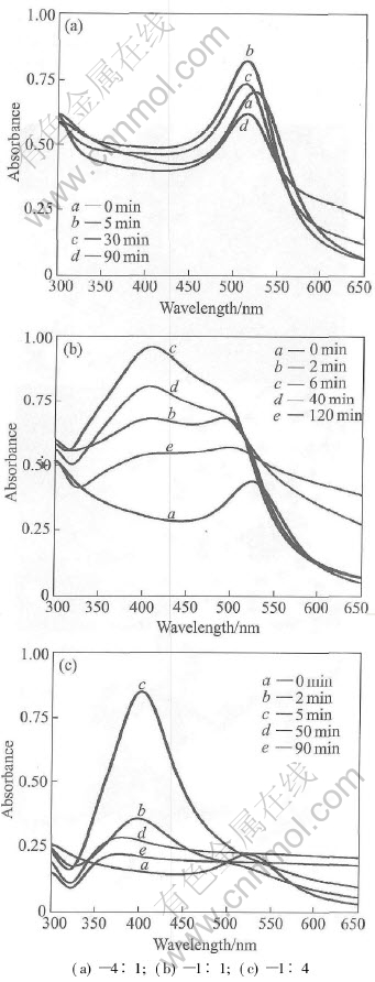 Fig.2 Evolution of UV-vis SPR spectra of Au-Ag composite particles with time at