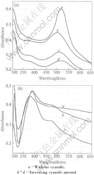 The previous studies[7, 10, 12] have demonstrated that the alloyed Au-Ag nanoparticles have only one SPR peak. When both Au and Ag colloid prepared with photoreduction were mixed by a certain ratio, two plasmon peaks appeared in the absorption spectra. Obviously, the SPR spectra recorded here are completely different from the above two cases. Based on determining CN- with Ag nanoparticles[15] and CN- dissolution rate for Au higher than that for Ag under ambient conditions, the Au core/Ag shell nanoparticle structure was confirmed again by the CN- dissolution experiments. Fig.4(a) shows that the SPR peak contributed from Ag nanoparticles precipitated on the surface of Au seed appeared due to the dissolution of Au at the molar ratio of Au to Ag 4∶1, indicating the formation of the partially Ag covered gold particles, i.e., a strawberry-like conformation. However, Fig.4(b) displays two SPR peaks to correspond to Ag and Au at the molar ratio of 1∶4 with the dissolution of Ag shell, revealing the formation of a shell layer on the surface of Au seed.
