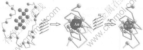 The mechanisms on the autocatalytic growth of the Au seed particles and stabilization by the pseudo-crown ether in PEG-acetone solution under the condition of UV radiation have been illustrated in detail in Ref.[14]. Similarly, in the presence of Au seed particles, Ag+ ions can be only catalytically reduced on the surface of Au particles in the UV irradiation process. More positive reduction potential of Au than Ag is an important factor, because the core-shell structure consisting of the Ag nucleus coated with Au particles cant be obtained in this reaction system due to the displacement reaction. In order to generalize the mechanism of forming bimetallic core-shell structure, a schematic illustration is given in Fig.5.