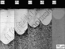 Fig.2 Depth of melted zone at different scan rates: (a) 73.2 mm/s; (b) 146.4 mm/s; (c) 219.6 mm/s; (d) 292.8 mm/s; (e) 366 mm/s