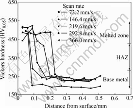 Fig.5 Vickers hardness distribution of AISI H13 at different scan rates