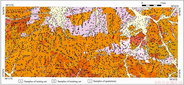 Figure 4 Spatial distribution of stream sediment geochemical sampling points, where black points are points in training dataset, red points are in testing dataset, and gray points are in Quaternary