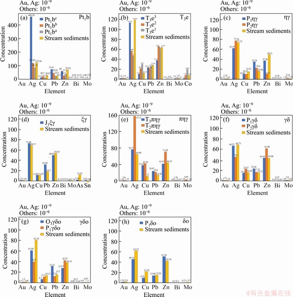Figure 5 Average concentrations of main mineralization elements in bedrocks, Lower Proterozoic Baishahe Group (Pt1b), Upper Triassic Elashan group (T3e), monzogranite (ηγ), moyite (ξγ), monzonitic granitic porphyry (πηγ), granodiorite (γδ), granite quartz diorite (γδο), and quartz diorite (δο), and their corresponding stream sediments (Blue curves describe mean values of element concentration in bedrocks during different geological periods, and red curves describe mean values of element concentration in their corresponding stream sediments)