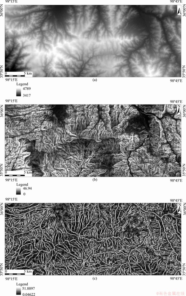 Figure 7 Images of elevation (a), slope (b) and slope of aspect (c) extracted from DEM