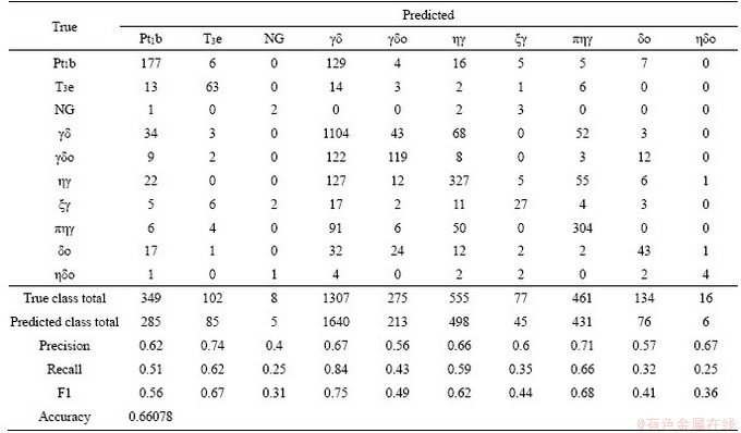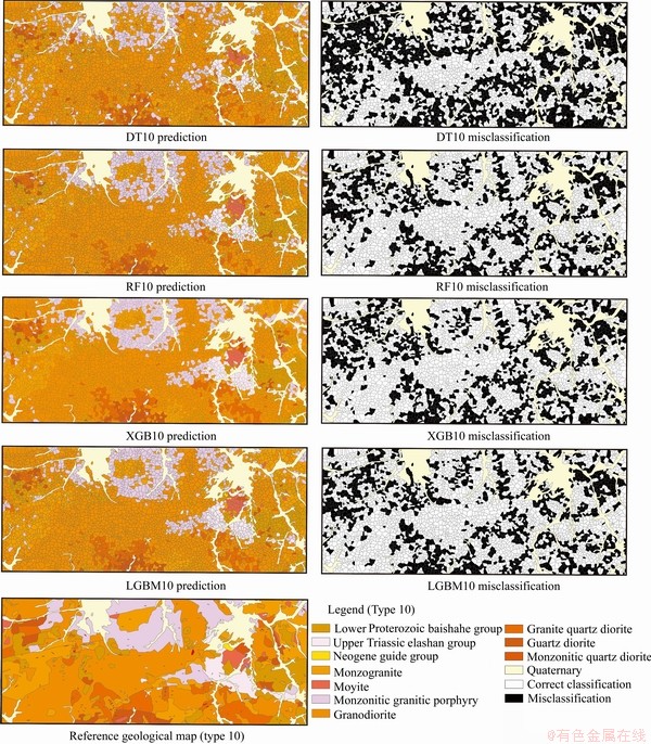 We present the confusion matrixes of the best performing algorithms XGB (Tables 5 and 6) and LGBM (Tables 7 and 8) in our two different classification tasks. In the ten-class lithostratigraphic classification, both precision and recall indices of the upper Triassic Elashan Group (T3e), granodiorite (γδ) and monzonitic granitic porphyry (πηγ) were higher than others, that is, the geochemical elements in these bedrocks are more likely to migrate to their corresponding stream sediments; thus, higher F1 scores were obtained. In the generalized five-class lithostratigraphic classification, the precision of each class was high, especially that for granite. As shown in Table 9, the two different classification tasks, the classification accuracy on the testing dataset is significantly improved after merging the lithostratigraphic types. It is well understood that in the multiclassification problem, the more targets a learner needs to distinguish, the more difficult it is. In addition, after merging the lithostratigraphic types, the distributions of samples belonging to the same lithostratigraphic type are more concentrated and the spatial associations between samples become closer. Therefore, the accuracy of the generalized five-class lithostratigraphic classification is higher than that of the ten-class. However, it is worth noting that there is a great imbalance of our training dataset. There are far more sampling points labeled granite (γ) and diorite (δ) than other types, and only eight sampling points labeled Neogene guide group (NG), which causes high classification accuracy of the granite and diorite and incredibly low classification accuracy of the Neogene guide group. Most machine learning algorithms are based on the assumption that the training dataset is balanced; however, it is difficult to obtain a balanced dataset for training in practical geoscience problems. Therefore, how to solve the classification error caused by data imbalance requires attention.