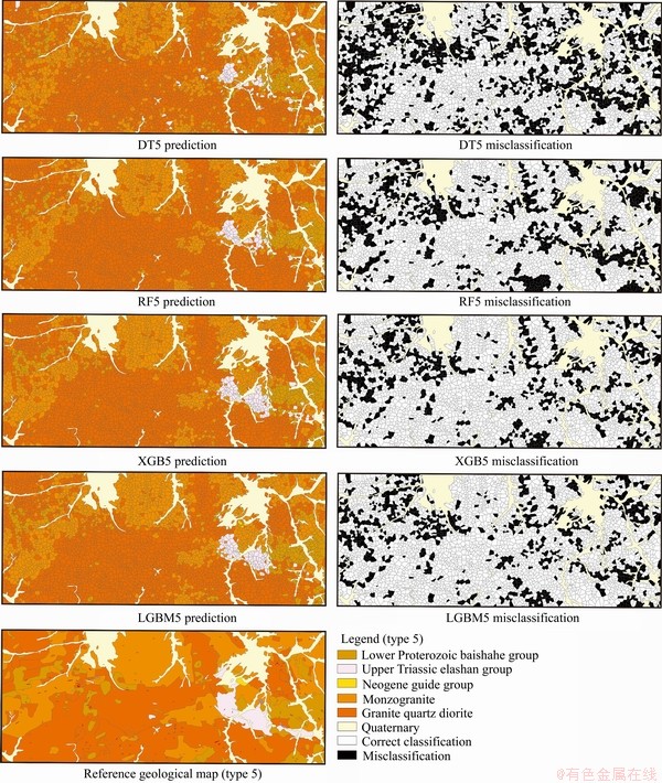 Figure 13 Spatial distribution of lithostratigraphic classification for generalized five-class lithostratigraphic classification (In addition to the dataset on the Quaternary coverage, the predicted lithostratigraphic type was gained, and the black polygons indicate the misclassification)