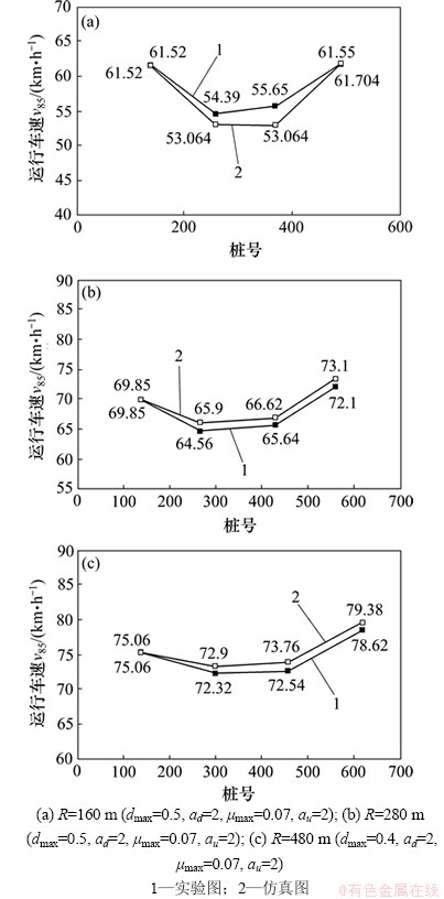 选取R为160,280和480 m的实验路段的线形资料作为实际道路输入,以观测断面1的车速特征值v85作为初始车速,仿真试算被选实验路段其余观测断面的特征车速,使之与该处的实验特征值v85尽可能接近(见图9),以此方法标定模型参数。